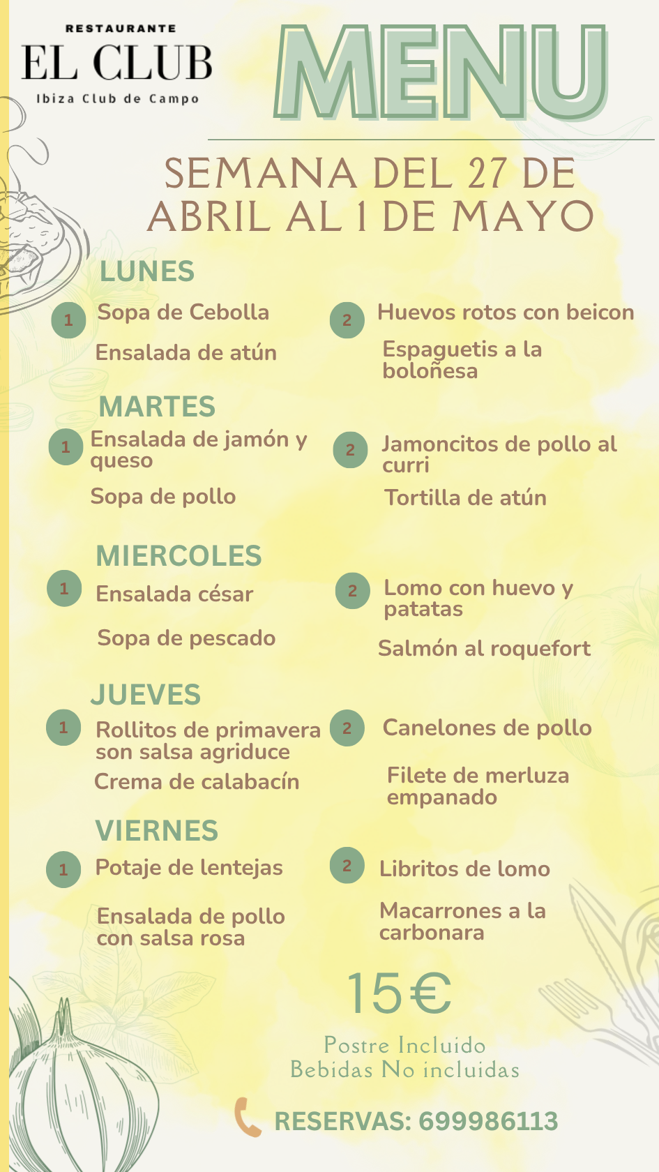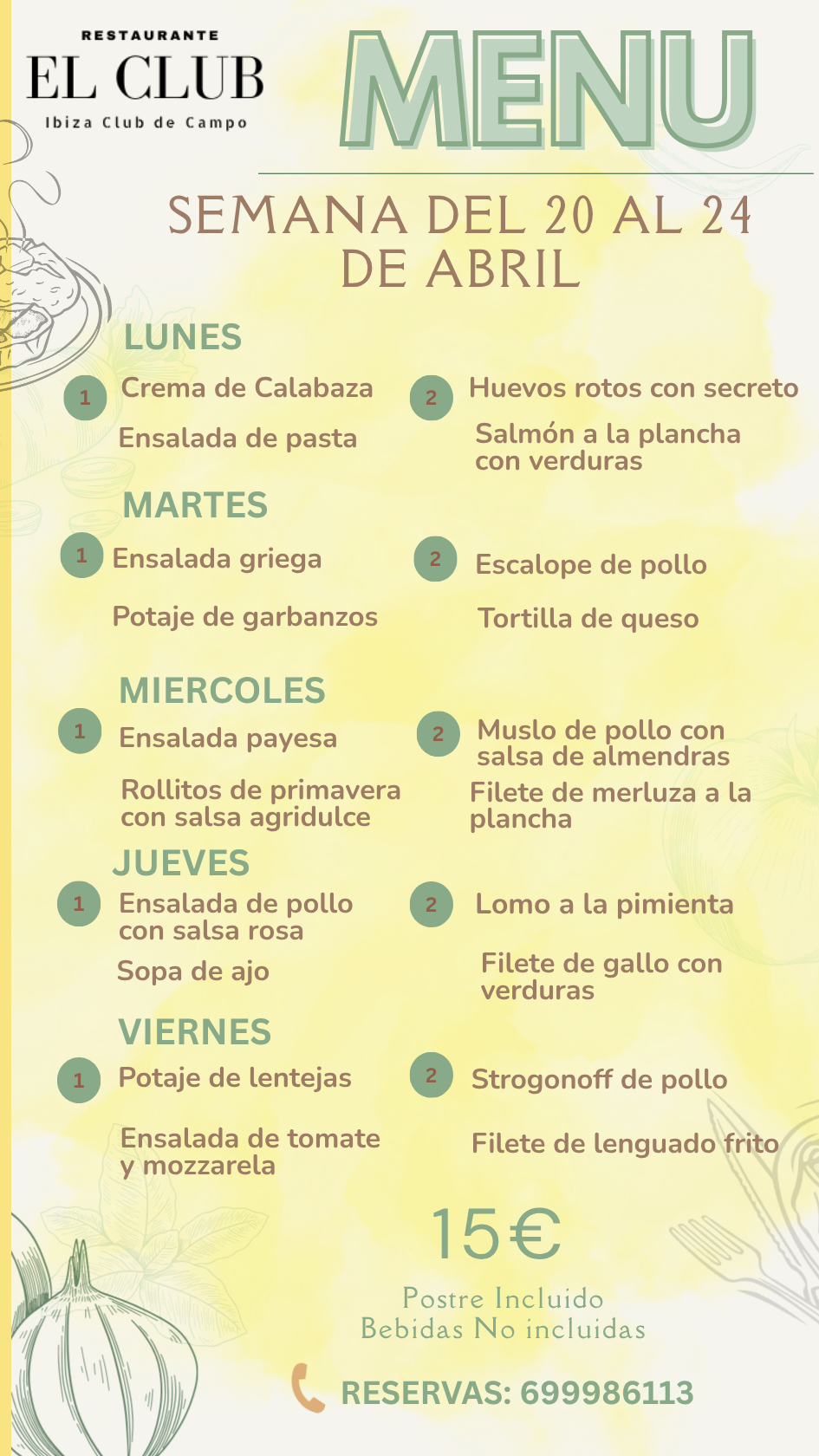 Recordamos que durante esta semana, concretamente, del 8 de 12 de Abril se celebrará en el Ibiza Club de Campo el II Torneo MT100 por lo que el menú durante esos días será diferente.
